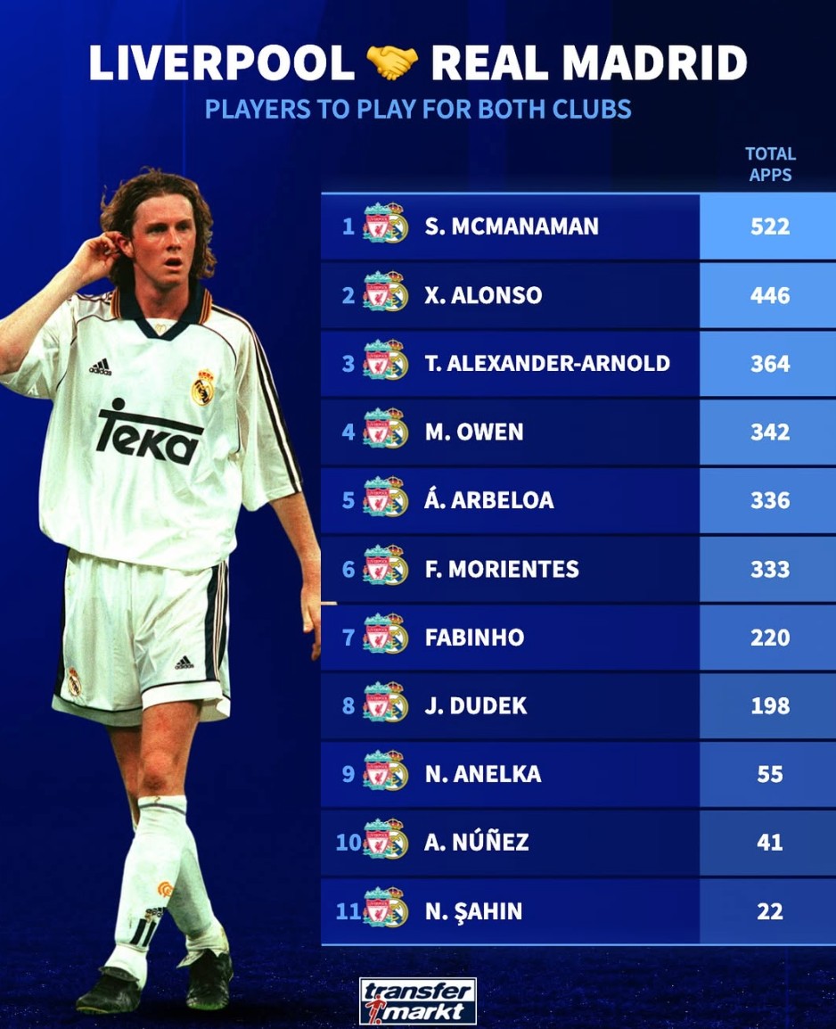 赛后有一份统计把“曾经代表两家俱乐部出场”的11名球员列了出来,紧接着引发了球迷群里的嘲笑和吐槽。榜单上头名是麦克马纳曼522场,第二是哈维-阿隆索446场,第三竟然是亚历山大-阿诺德364场,第四迈克尔-欧文342场,第五到第十一名依次写着阿韦洛亚336场、莫伦特斯333场、法比尼奥220场、杜德克198场、阿内尔卡55场、安东尼奥-努涅斯41场、沙欣22场。把这串数字拿到英超或欧冠的酒吧里念一遍,人们会怀疑你是不是在考验他们的视力。
